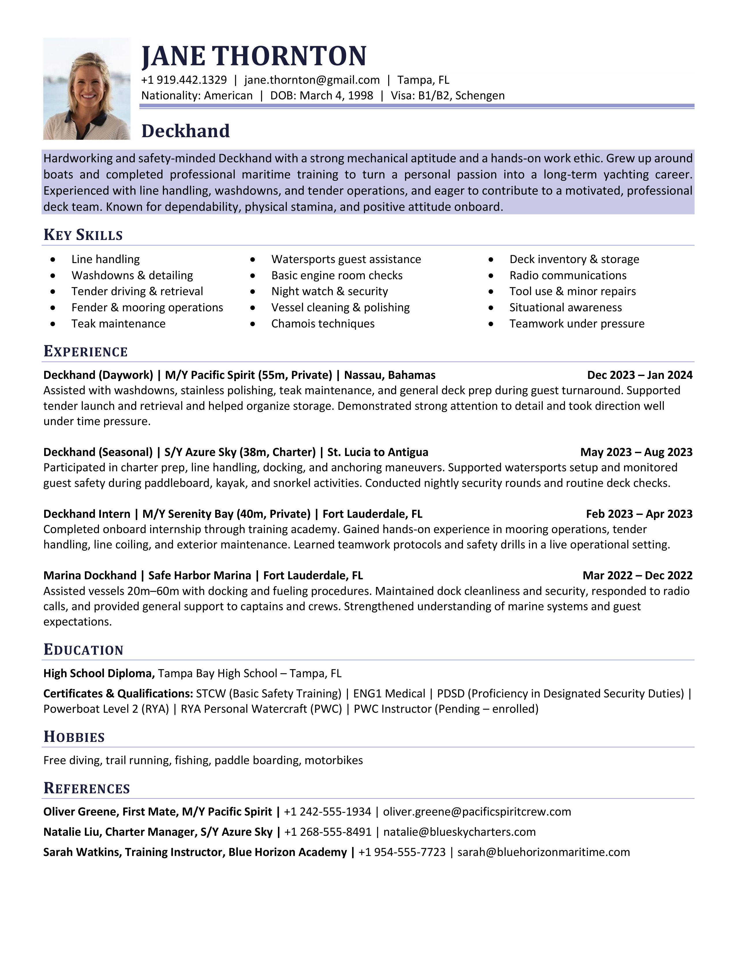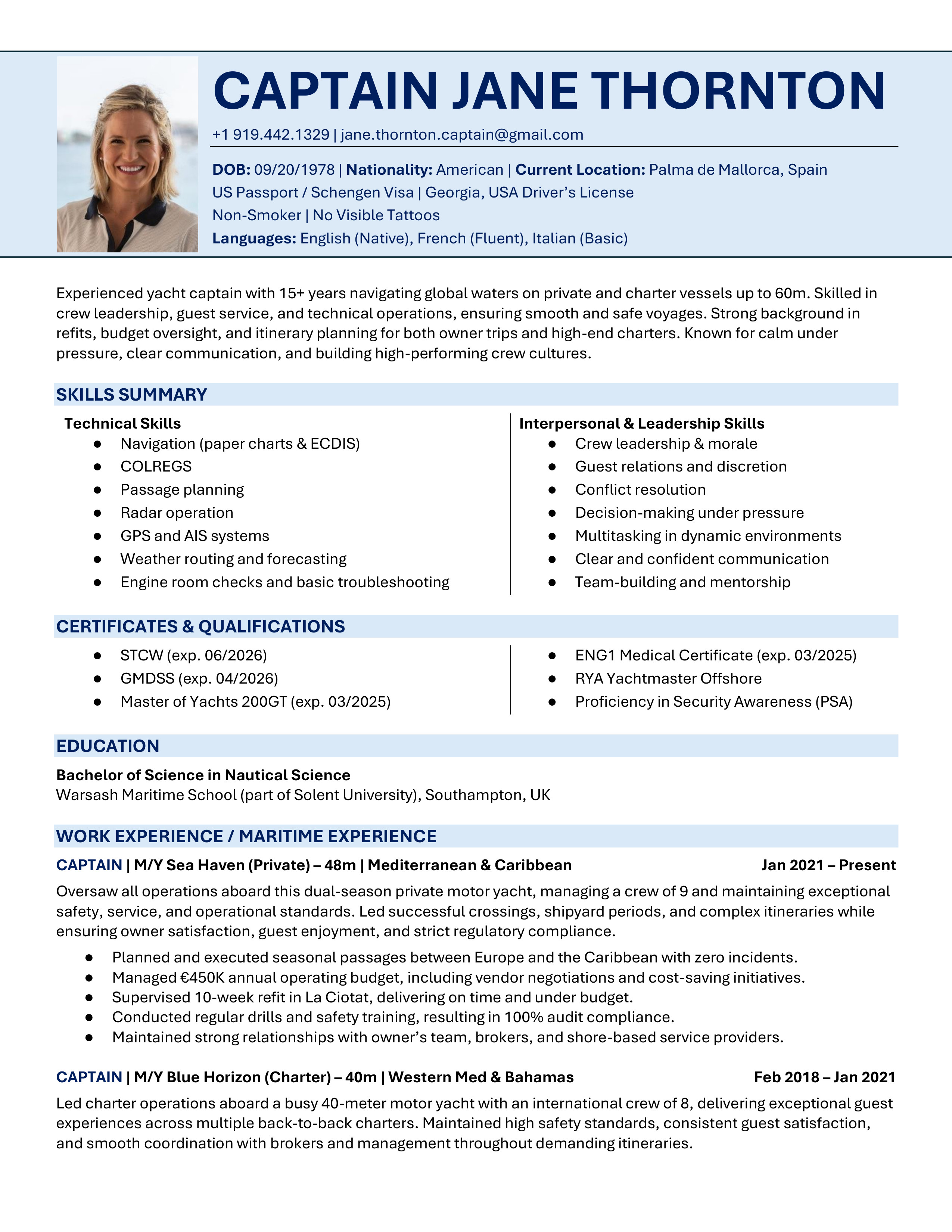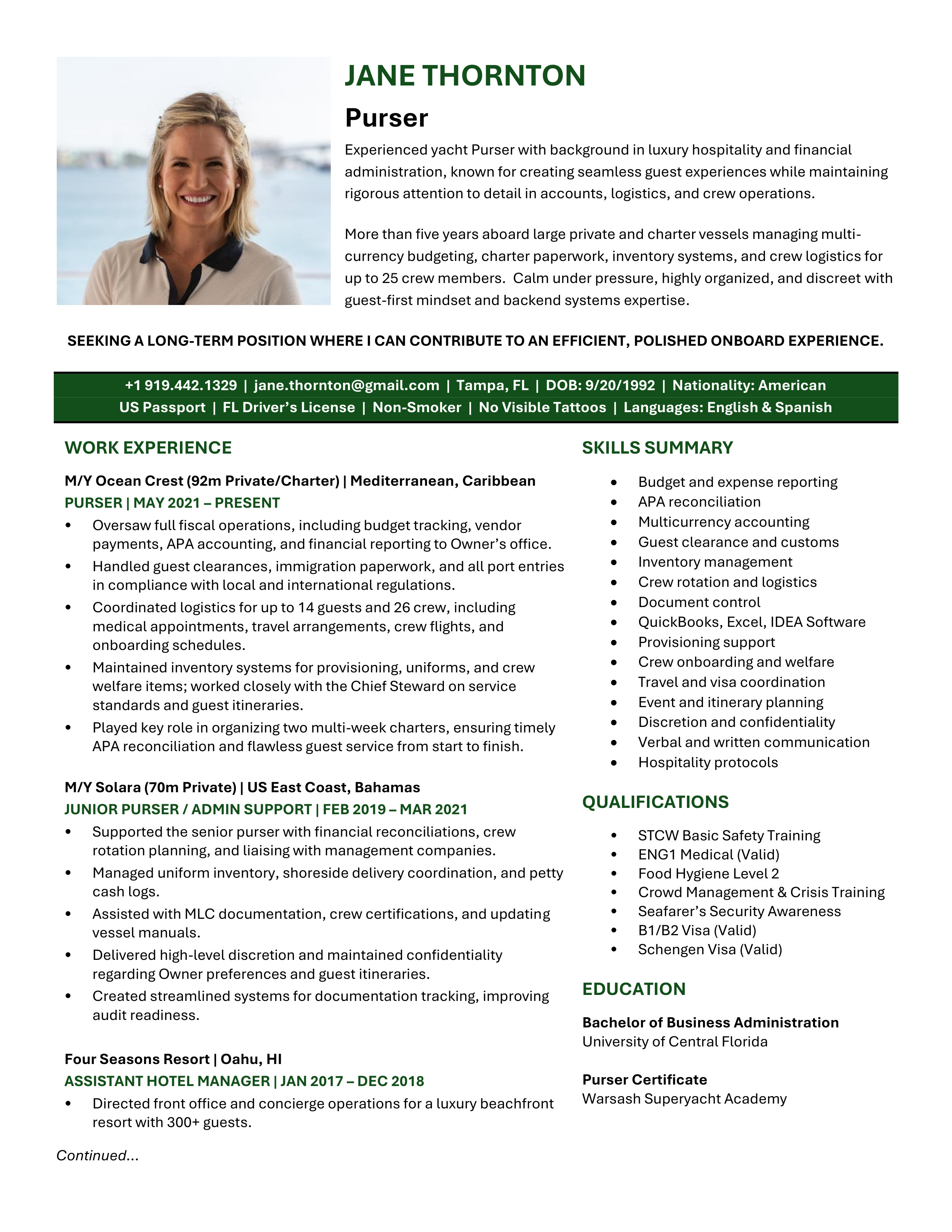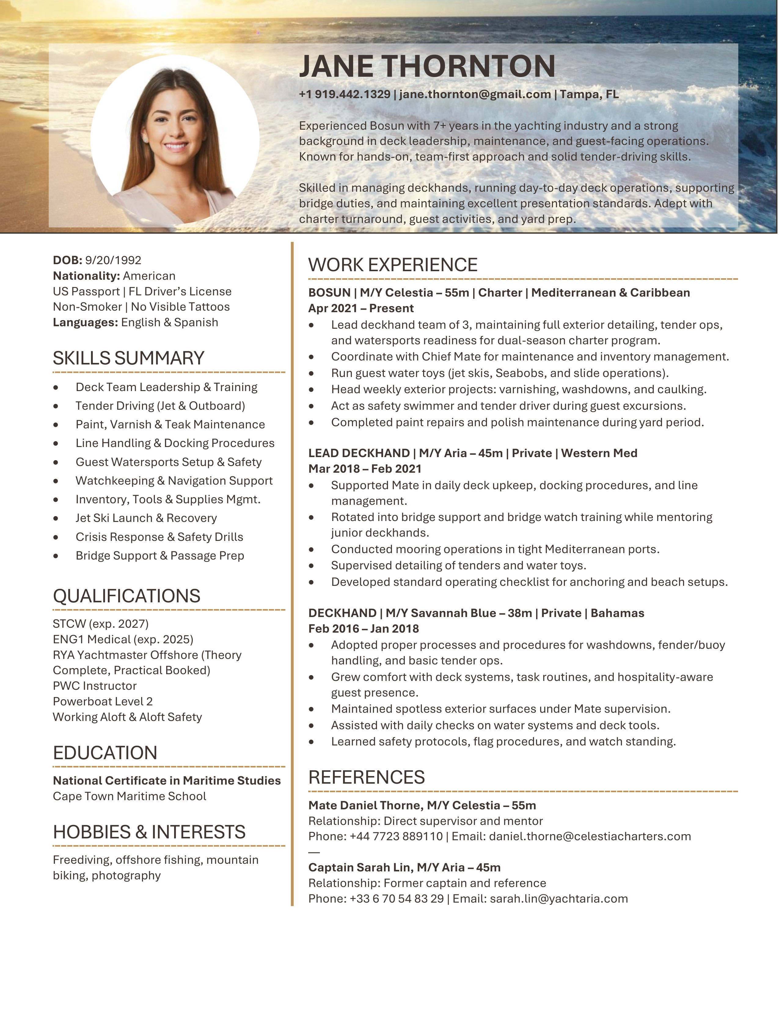 A polished yacht CV template designed to clearly showcase your qualifications, skills and experience. Easy to edit and built to meet recruiter, management company, captain and HoD expectations. You will receive both the Microsoft Word and the Google Doc versions. Includes access to the CV Support Hub where you will find an easy to follow How-To Guide and short step by step How-To Videos.