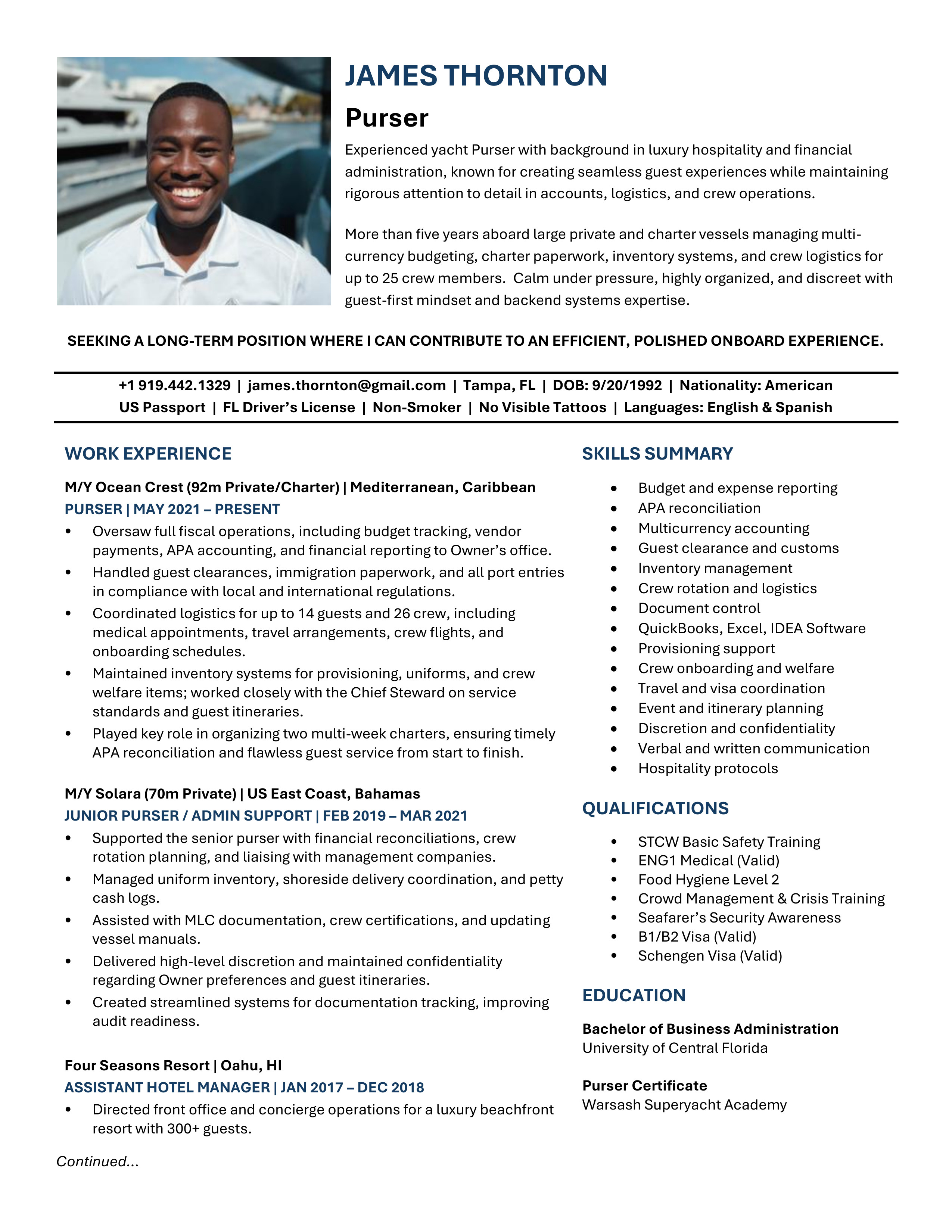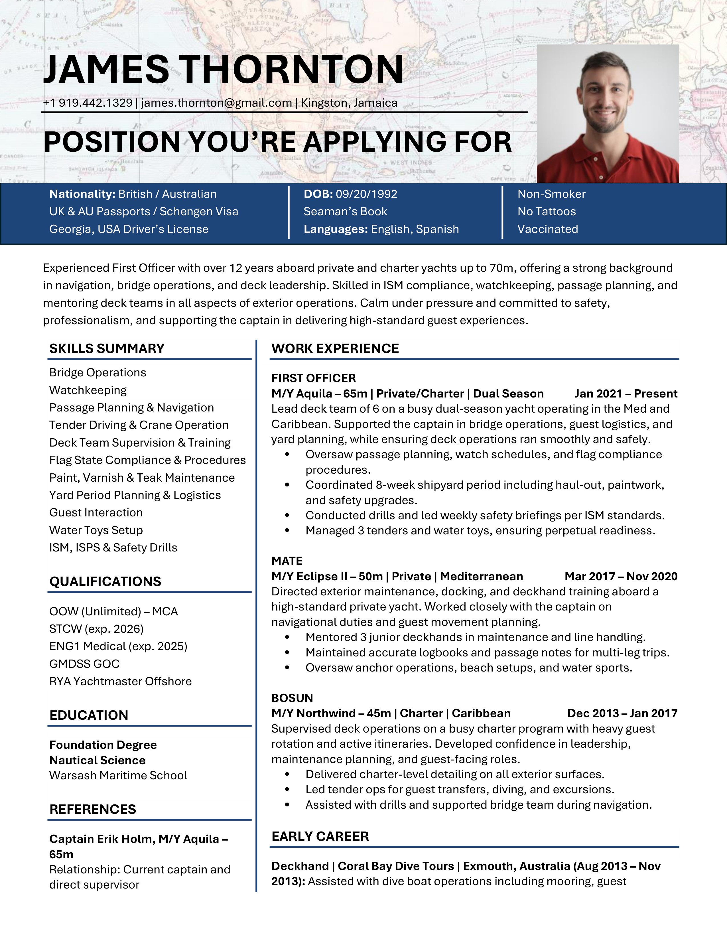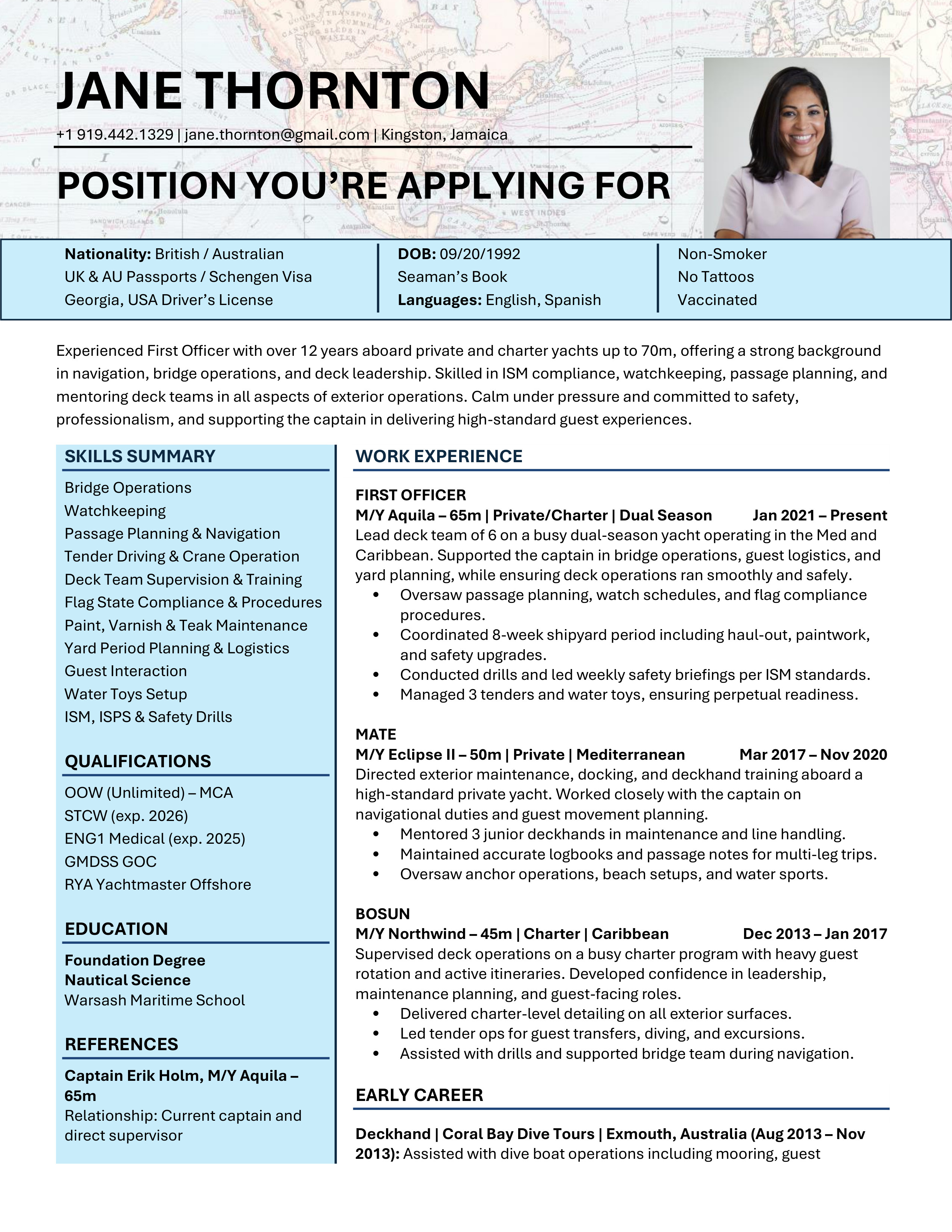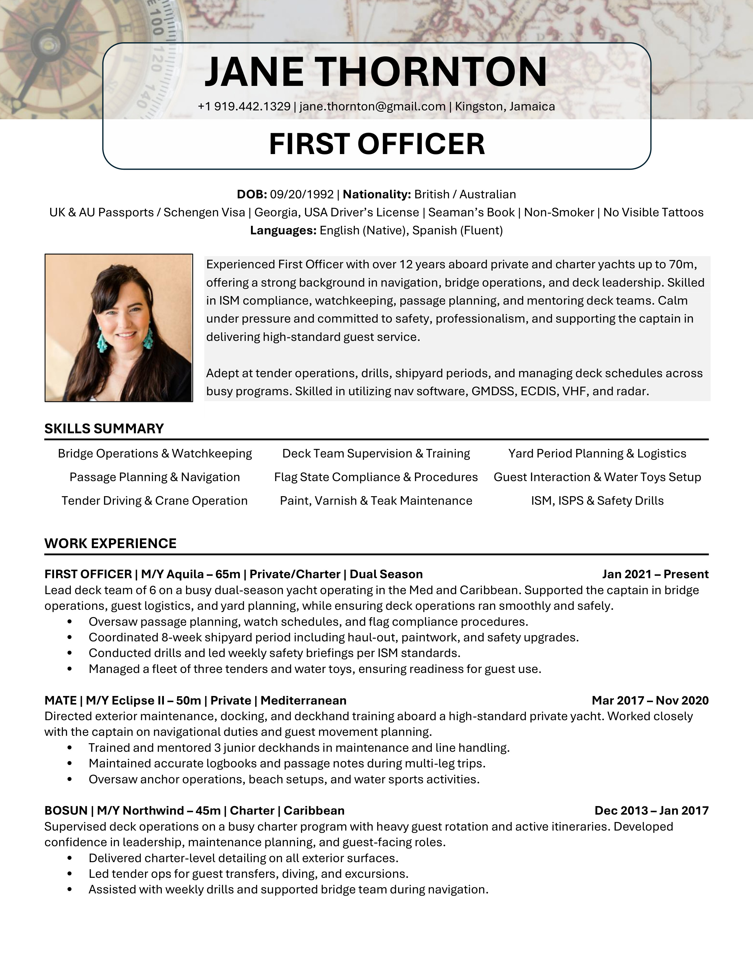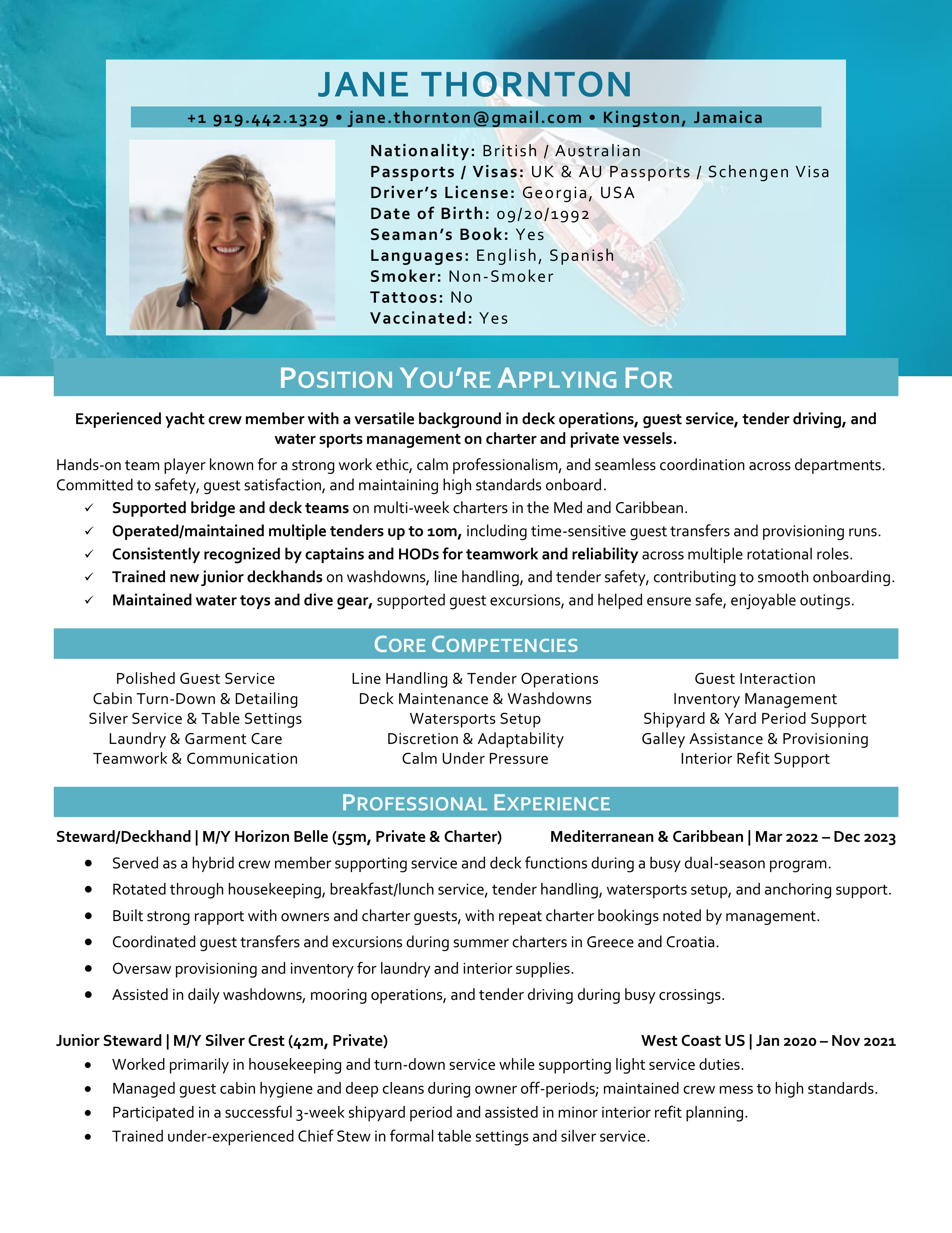 A polished yacht CV template designed to clearly showcase your qualifications, skills and experience. Easy to edit and built to meet recruiter, management company, captain and HoD expectations. You will receive both the Microsoft Word and the Google Doc versions. Includes access to the CV Support Hub where you will find an easy to follow How-To Guide and short step by step How-To Videos.