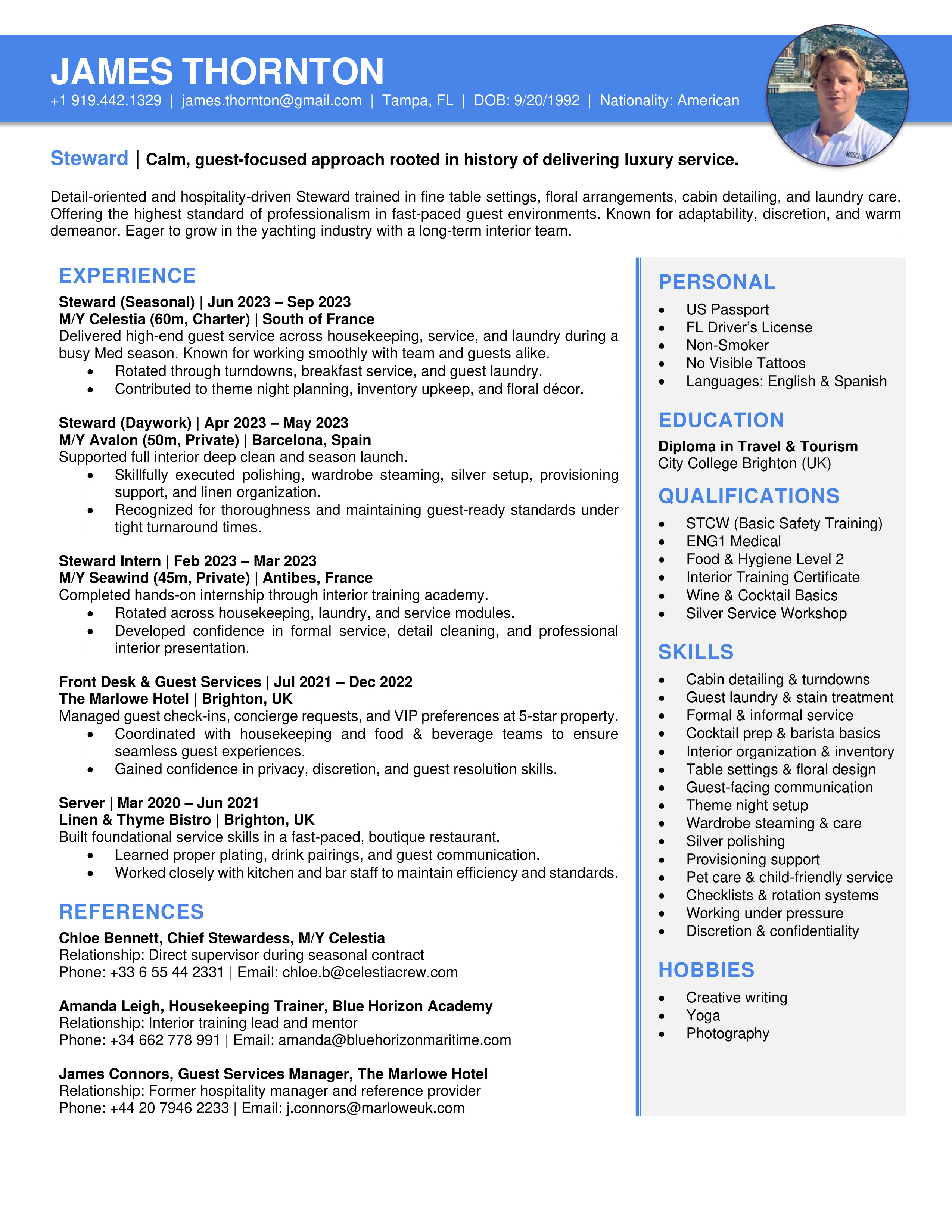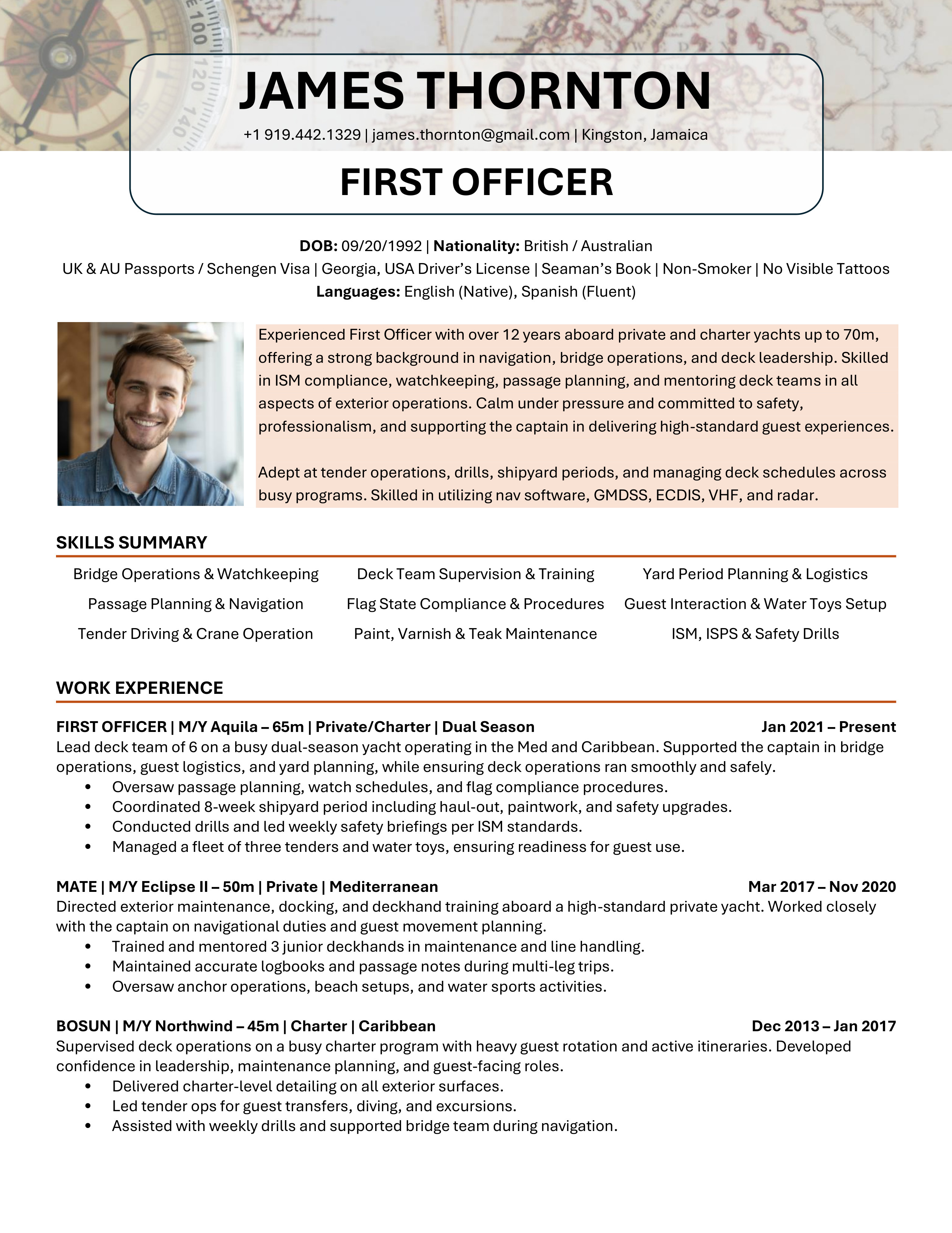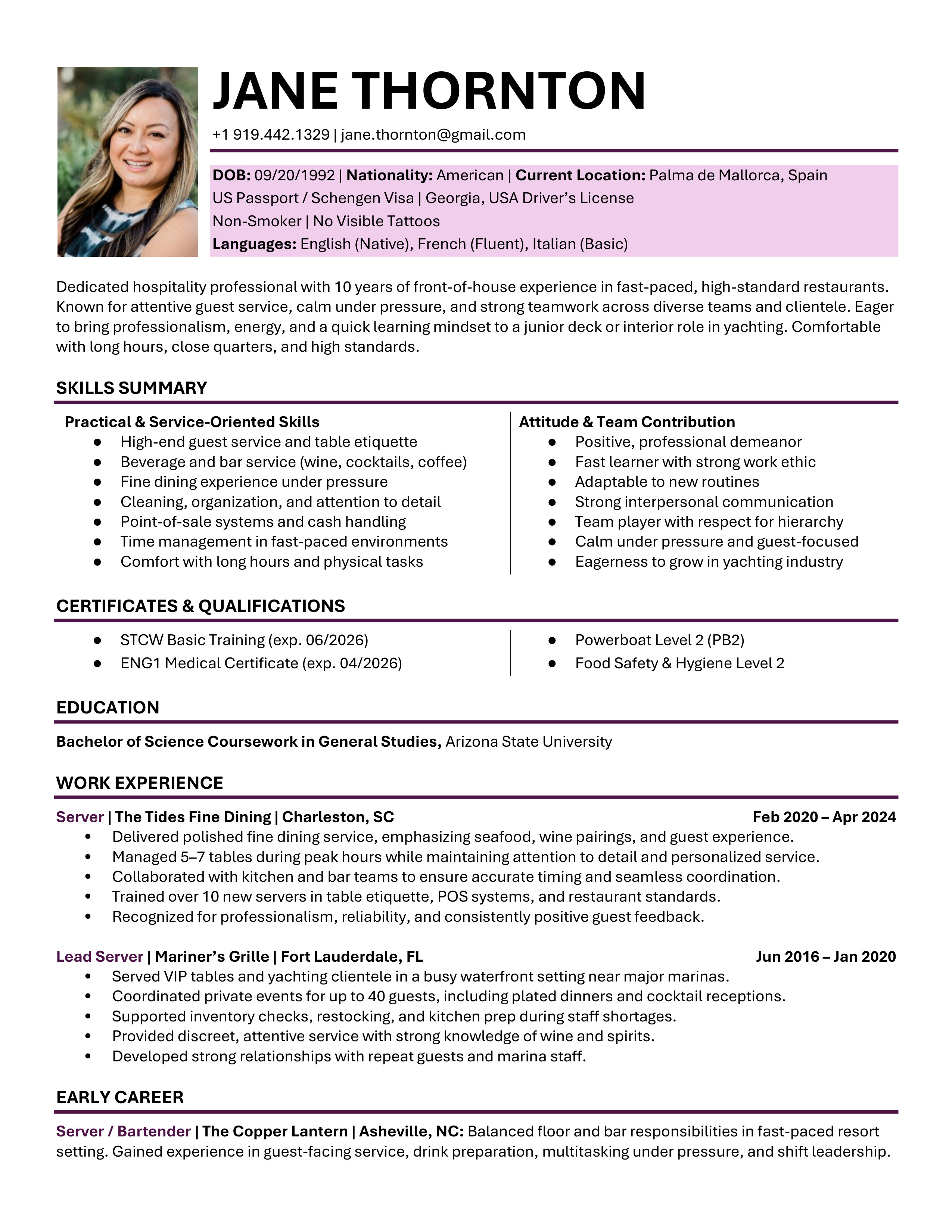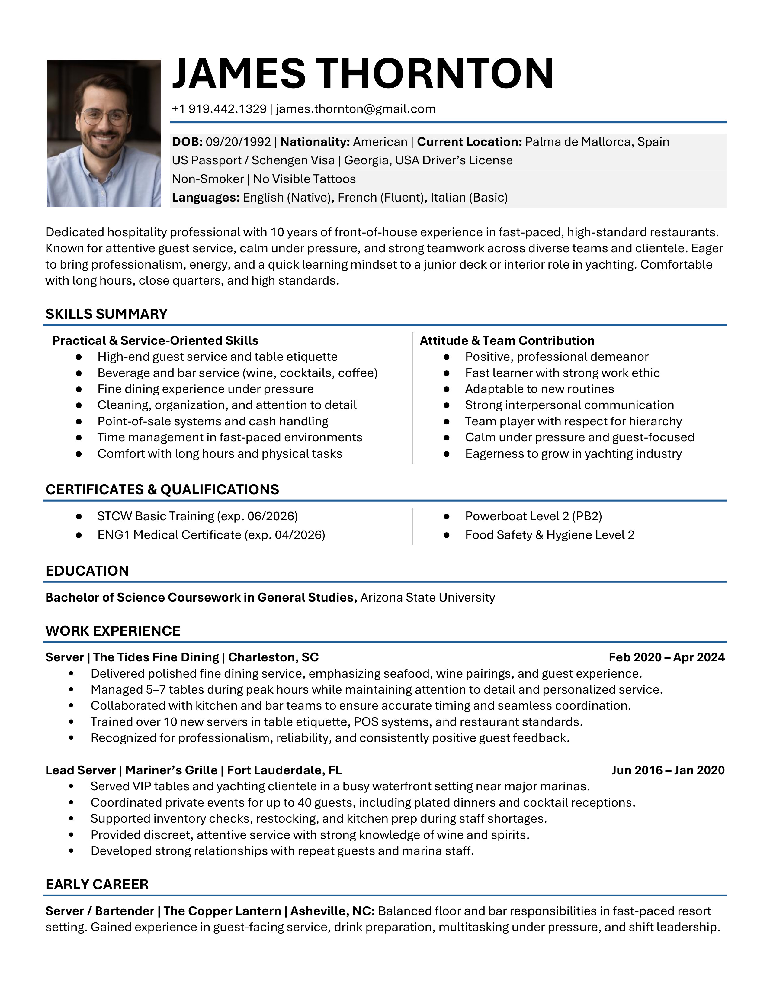 A polished yacht CV template designed to clearly showcase your qualifications, skills and experience. Easy to edit and built to meet recruiter, management company, captain and HoD expectations. You will receive both the Microsoft Word and the Google Doc versions. Includes access to the CV Support Hub where you will find an easy to follow How-To Guide and short step by step How-To Videos.